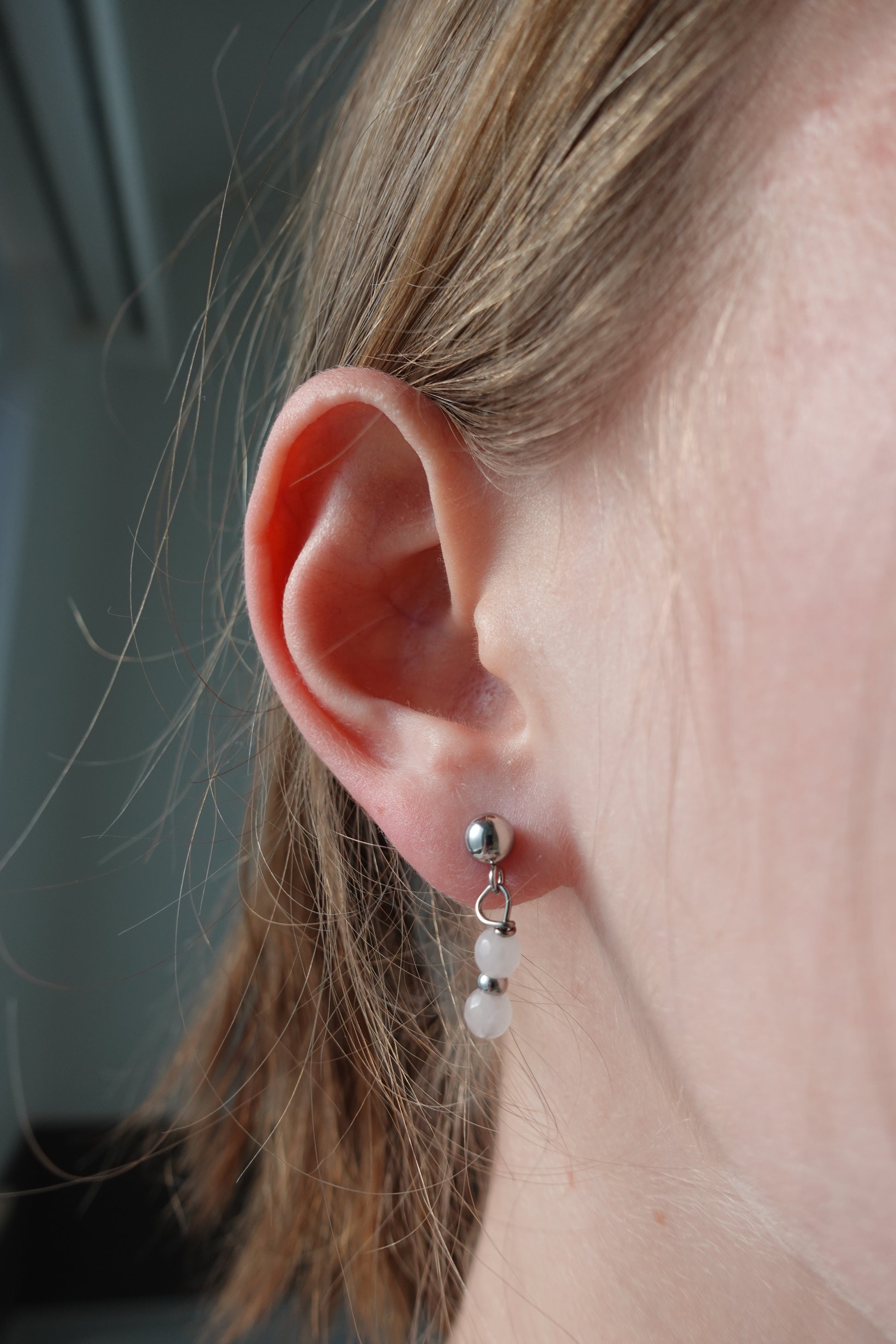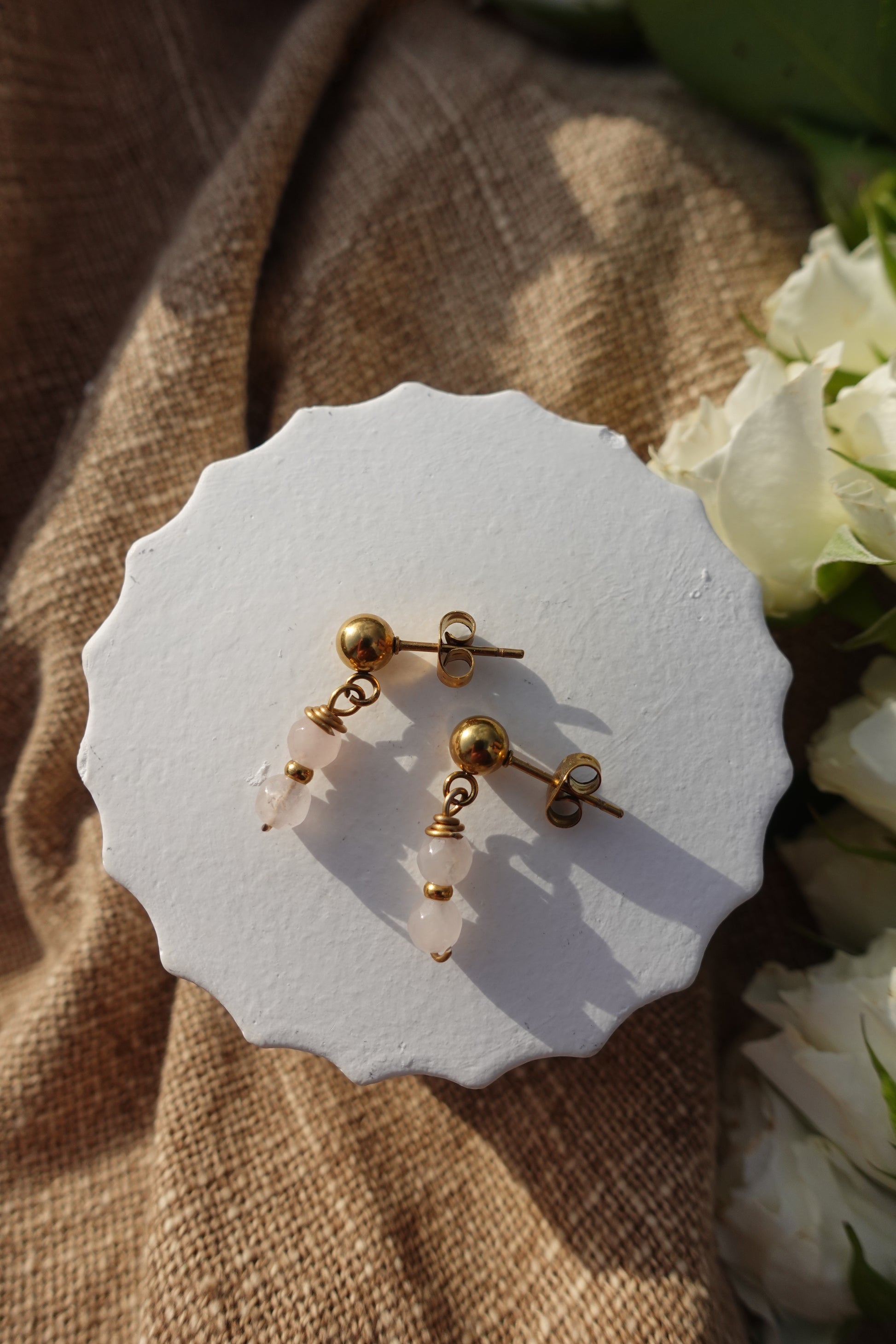 Boucles d'oreilles réalisées avec à base de perles de quartz rose et d'acier inoxydable.
