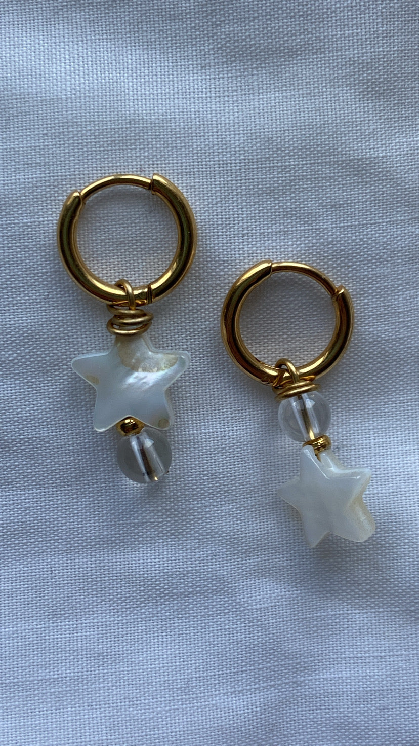 Boucle d'oreilles réalisées à base de perles de cristal de roche, de coquillage et d'acier inoxydable