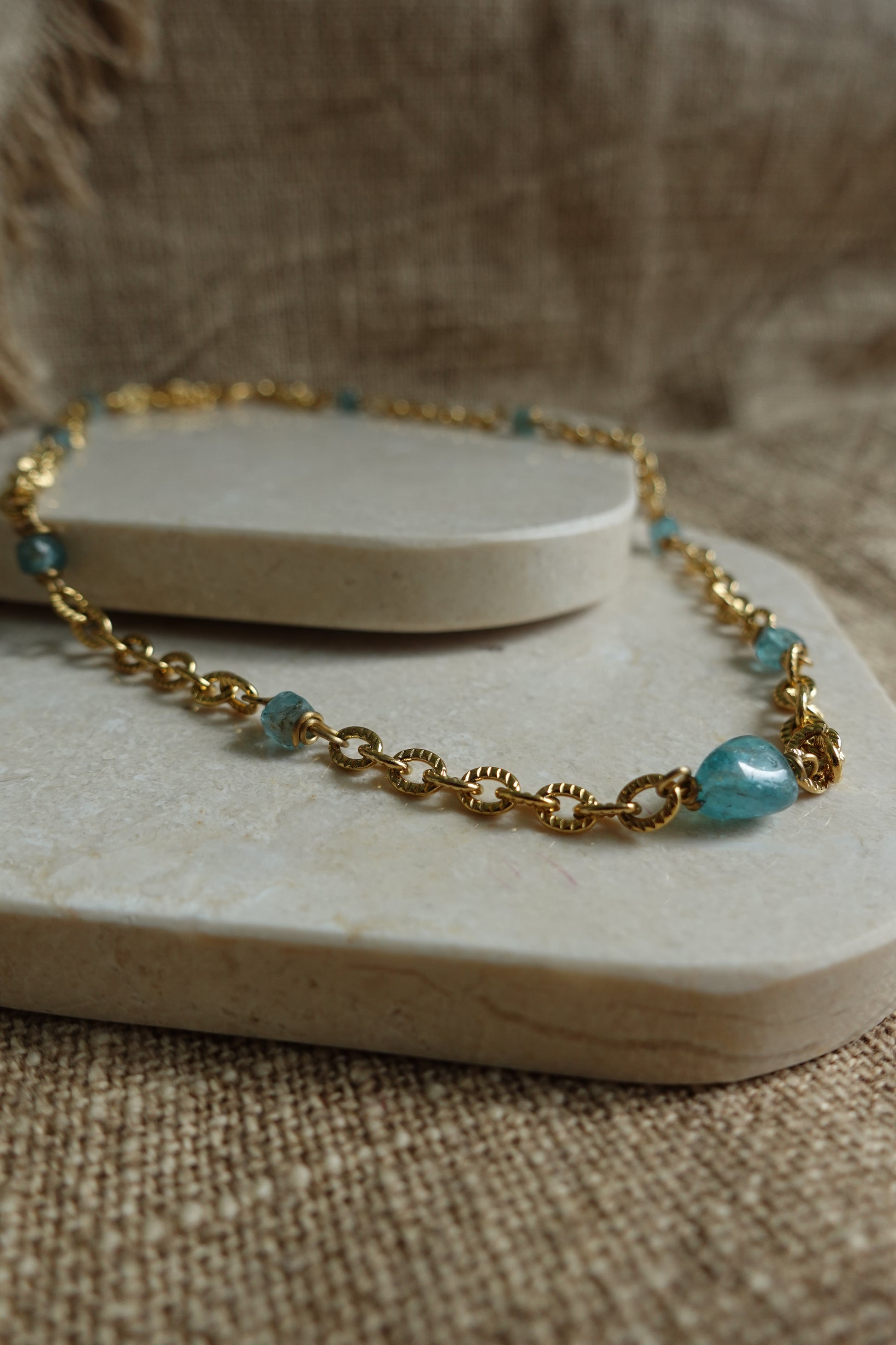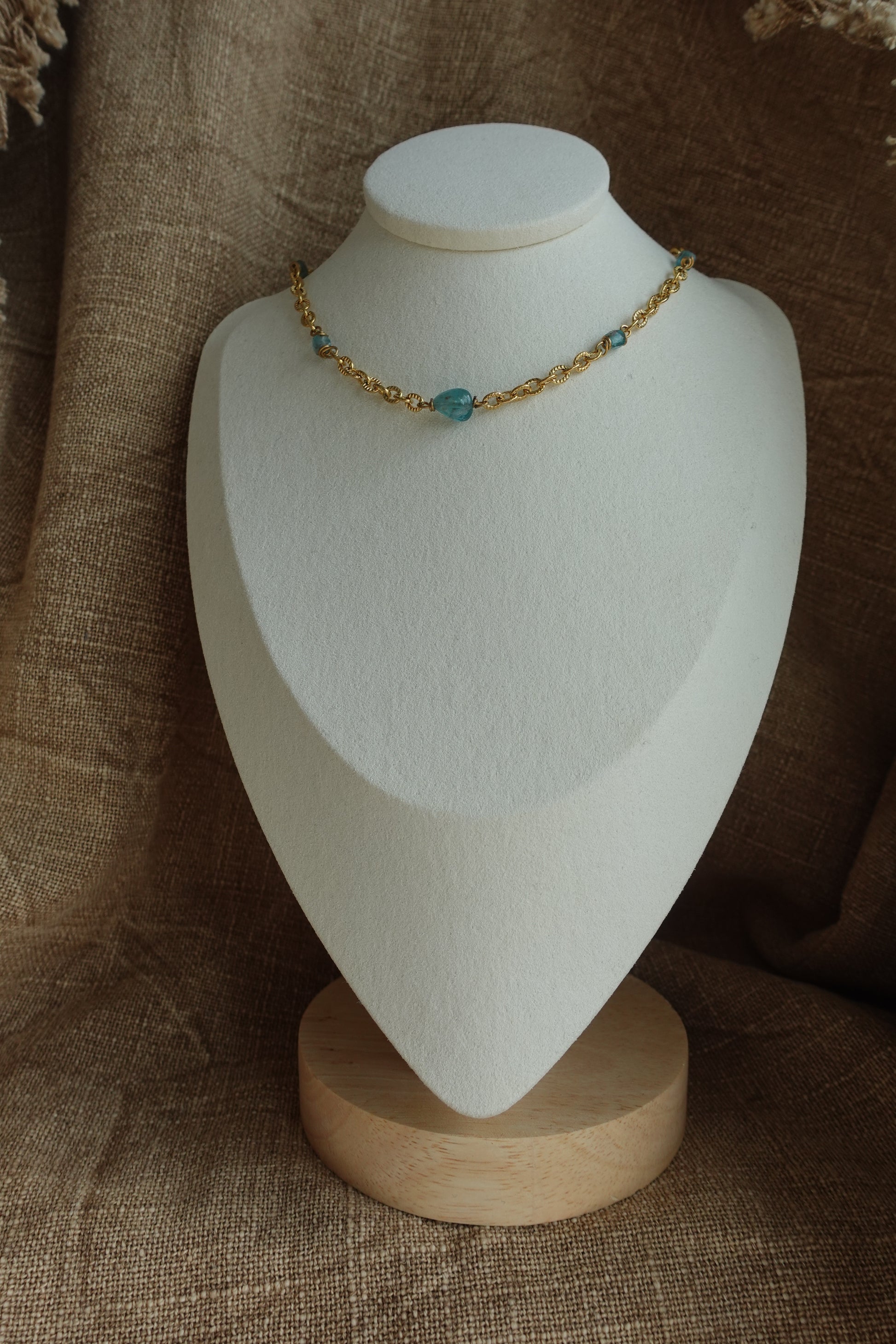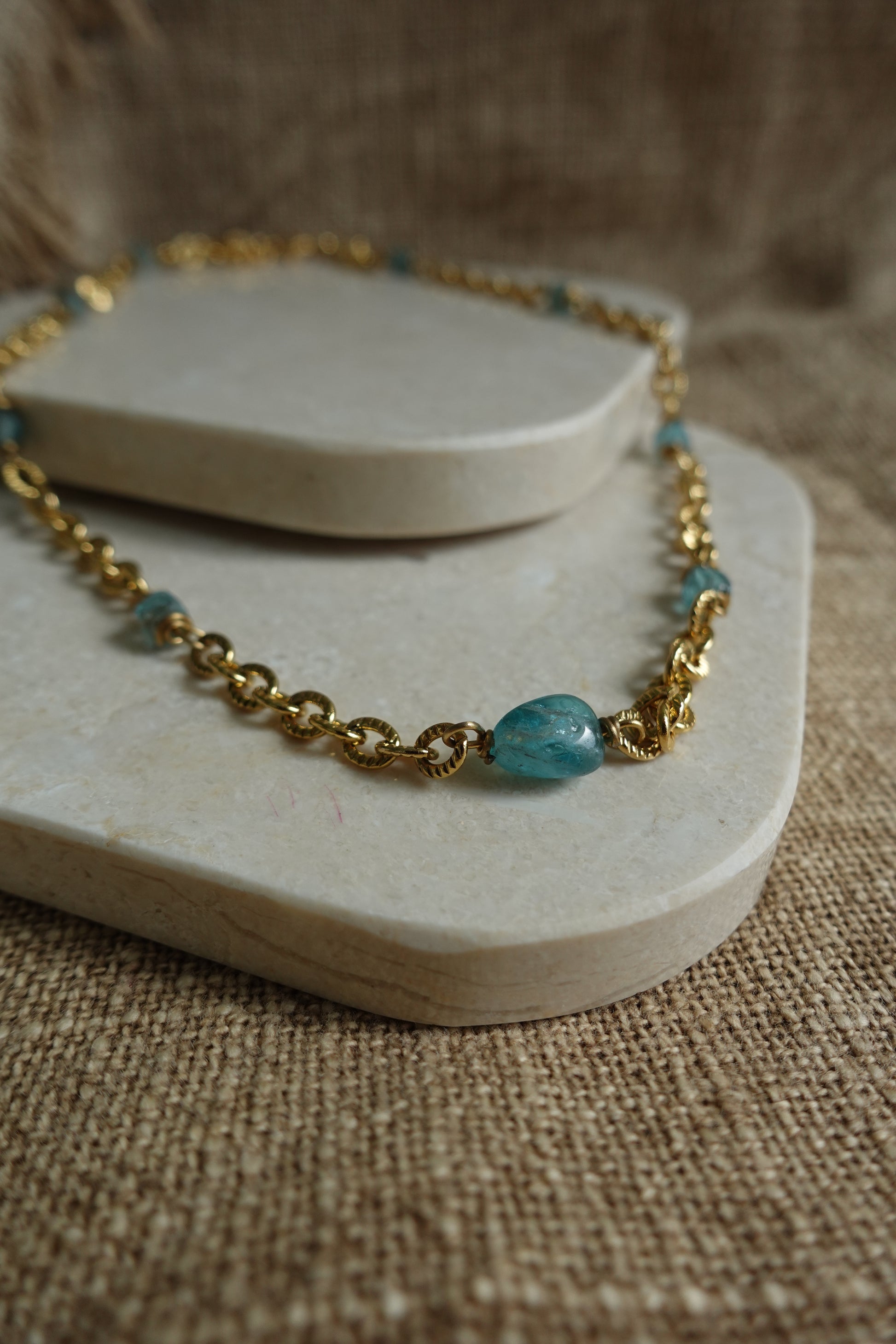 Modèle unique réalisé à la main en apatite et acier inoxydable doré.