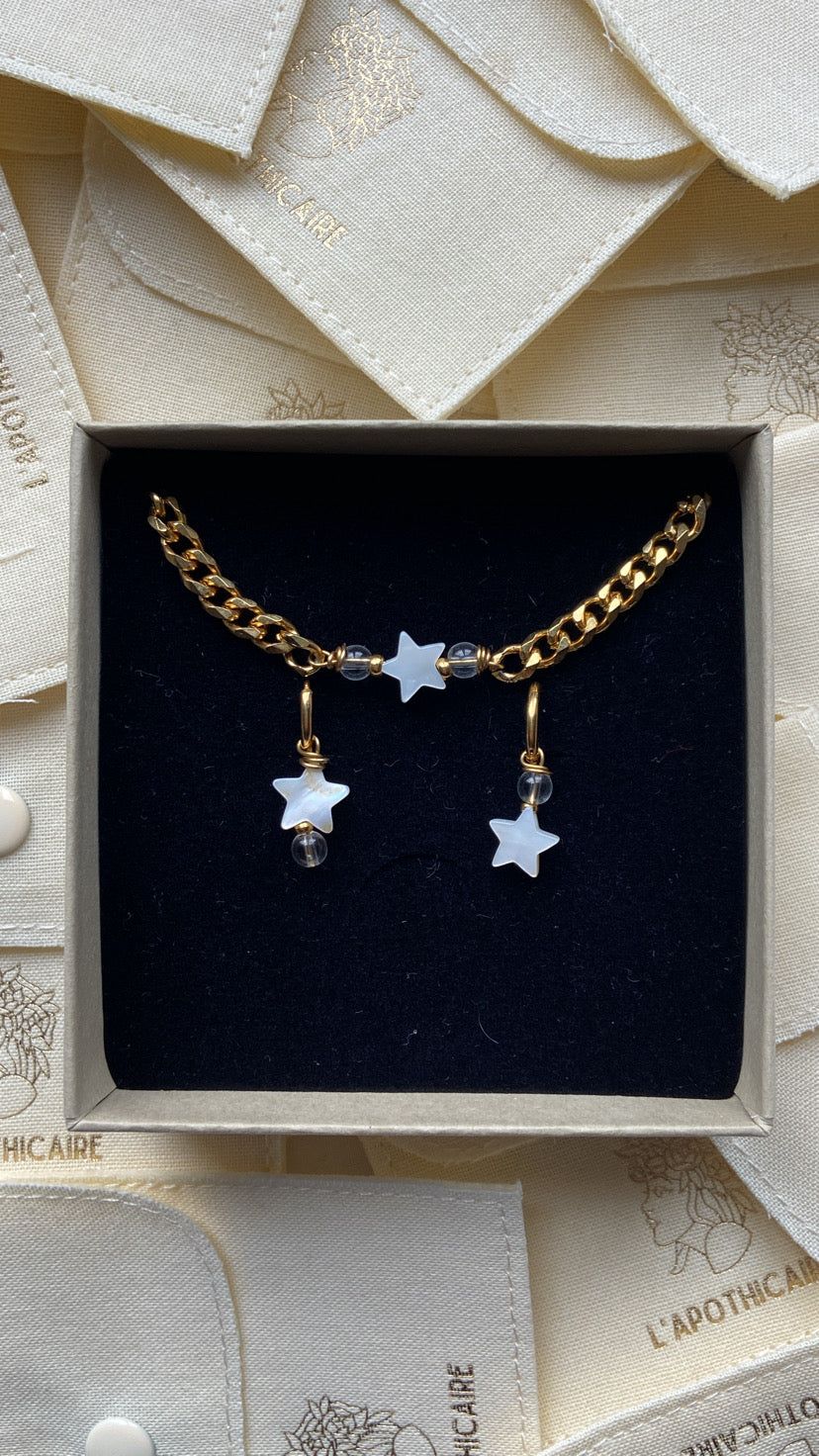 Inspiré par Astraea, déesse de la justice et des étoiles dans la mythologie grecque, ce collier évoque la pureté et la lumière des cieux. Symbole de l'équilibre cosmique et de la sagesse céleste, Astraea incarne l'éclat des étoiles et l'harmonie divine qui guide les destinées.