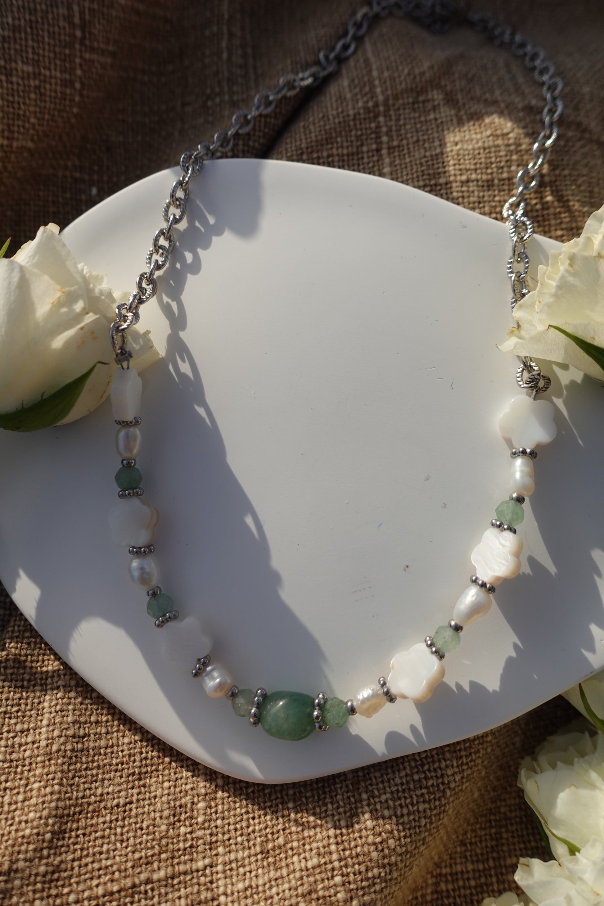 Collier réalisé à base d'aventurine verte, de perles d'eau douces, de perles en coquillages et d'acier inoxydable.