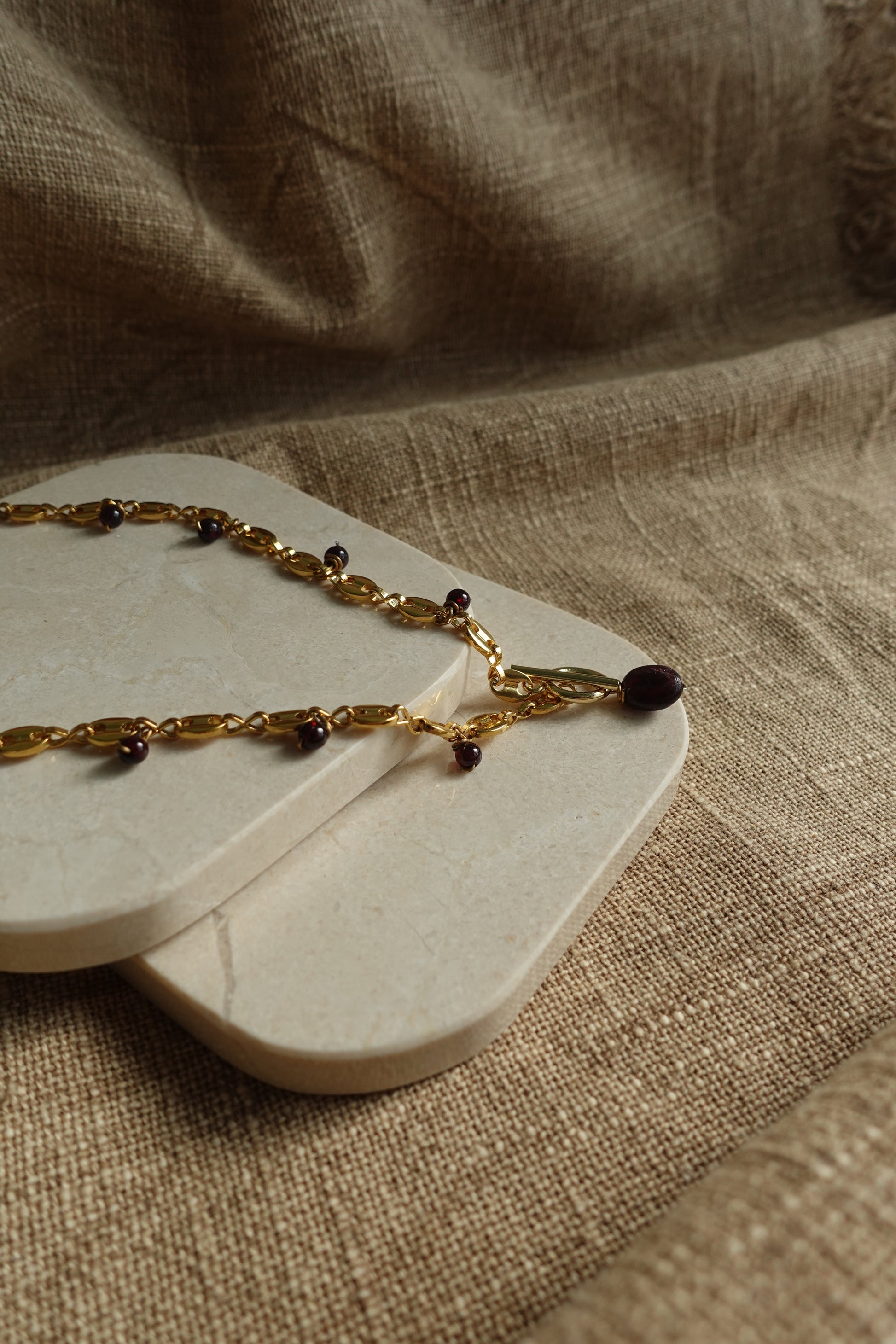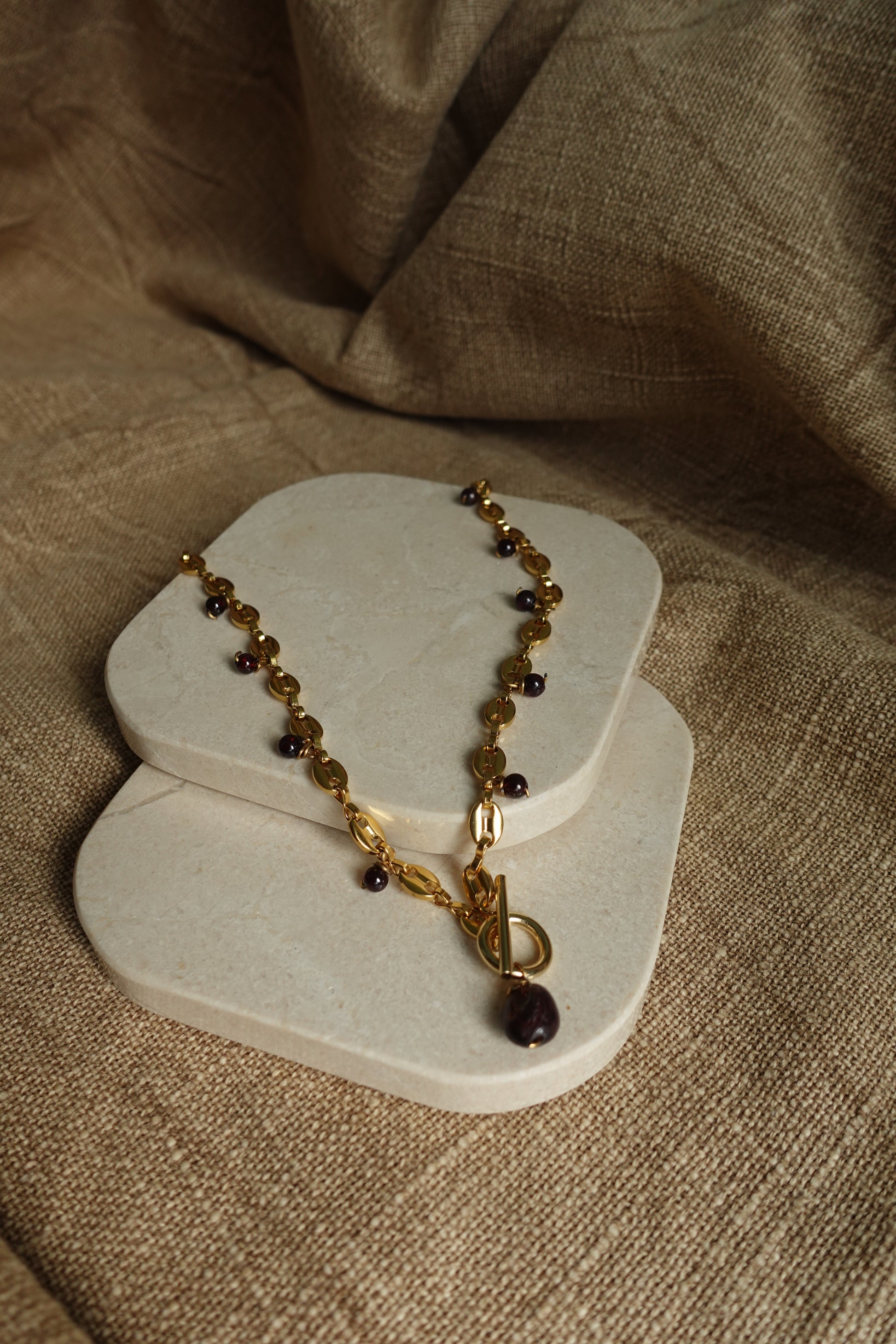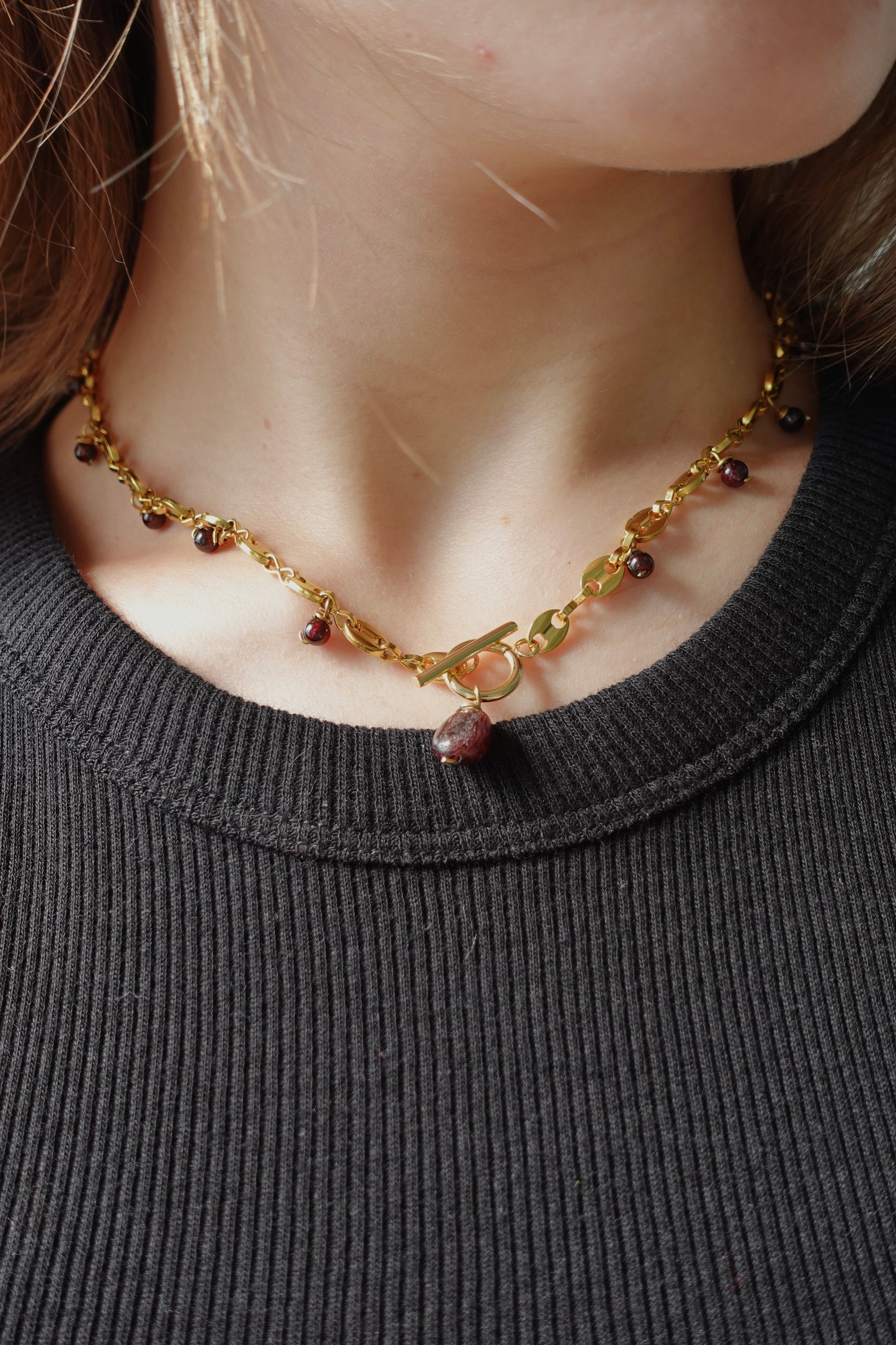 Modèle unique réalisé avec en acier inoxydable doré et en perles de grenat.