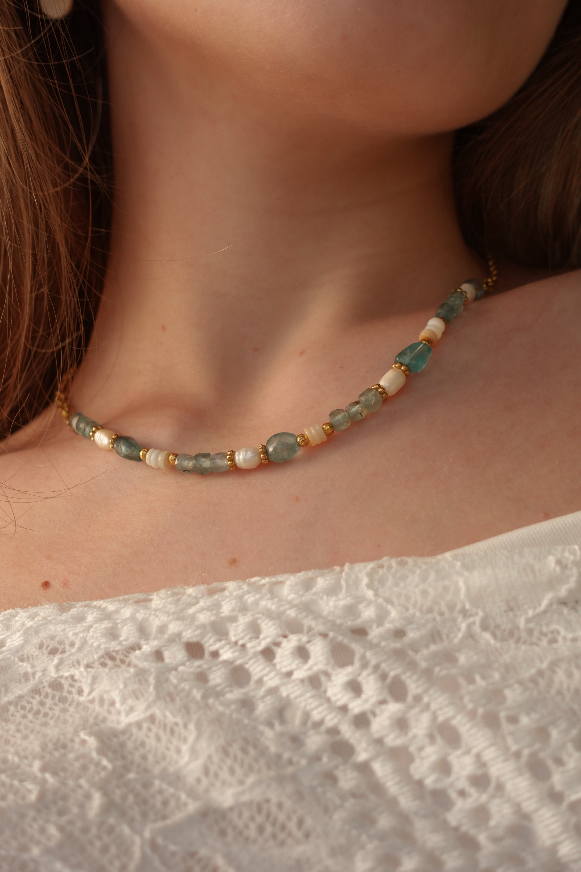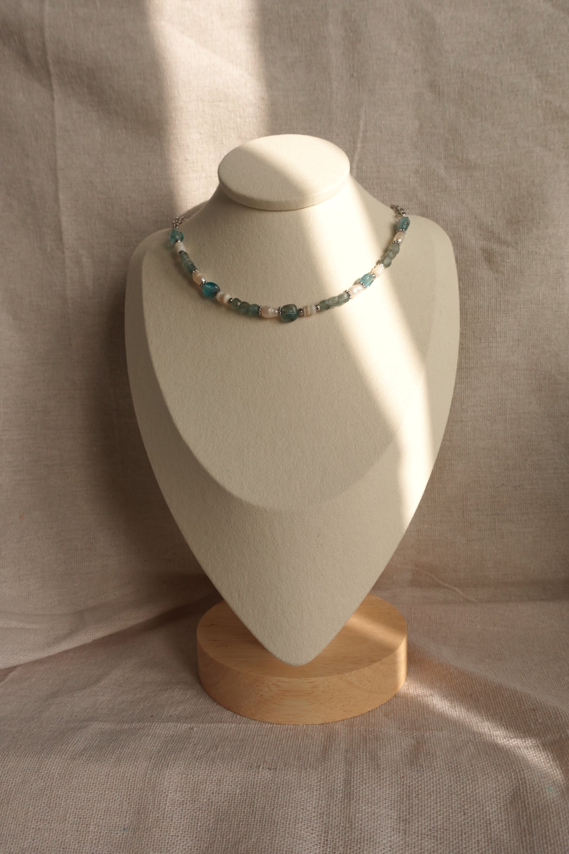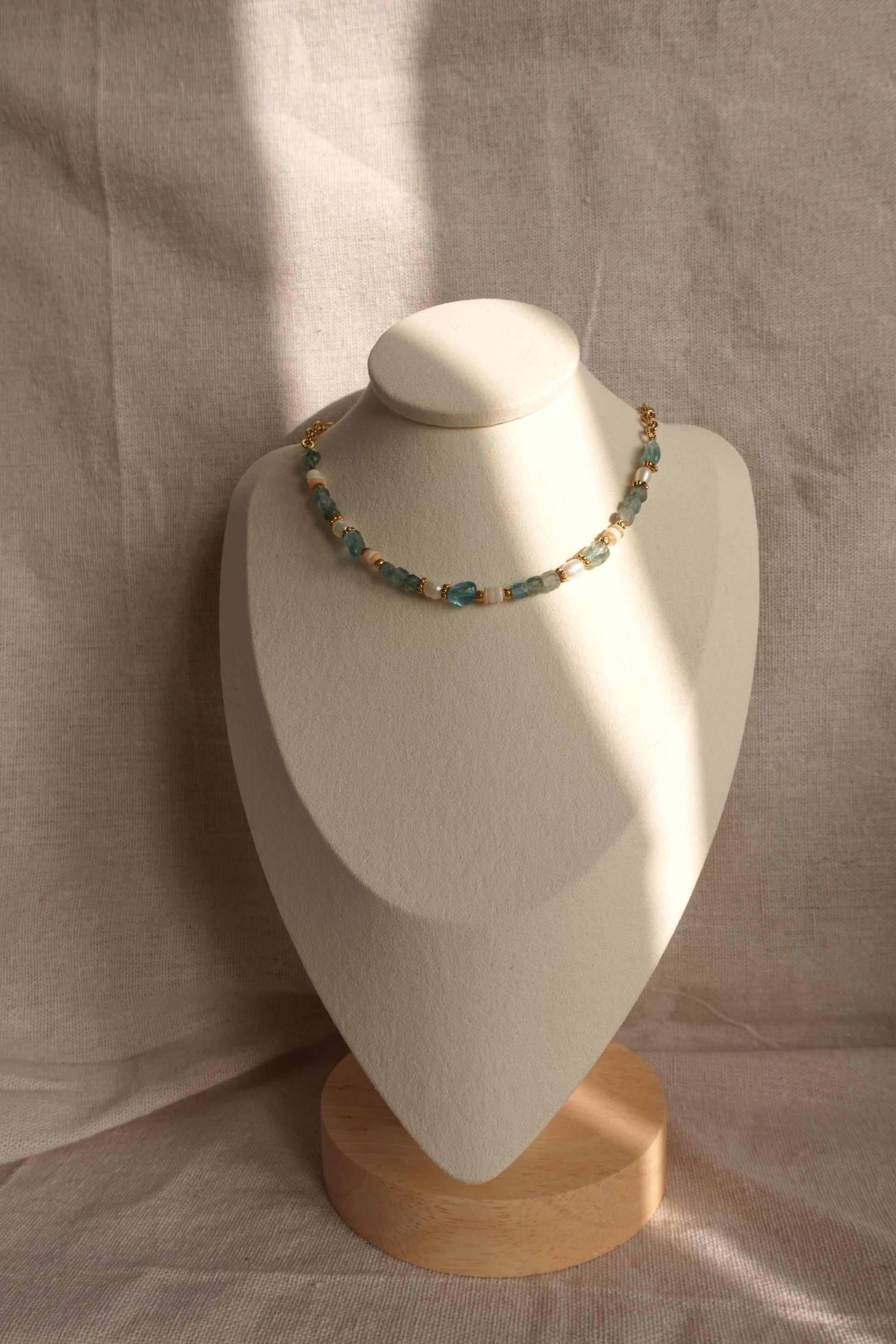 Collier réalisé à la main, à base d'apatite bleue, de perles d'eau douce et d'acier inoxydable.