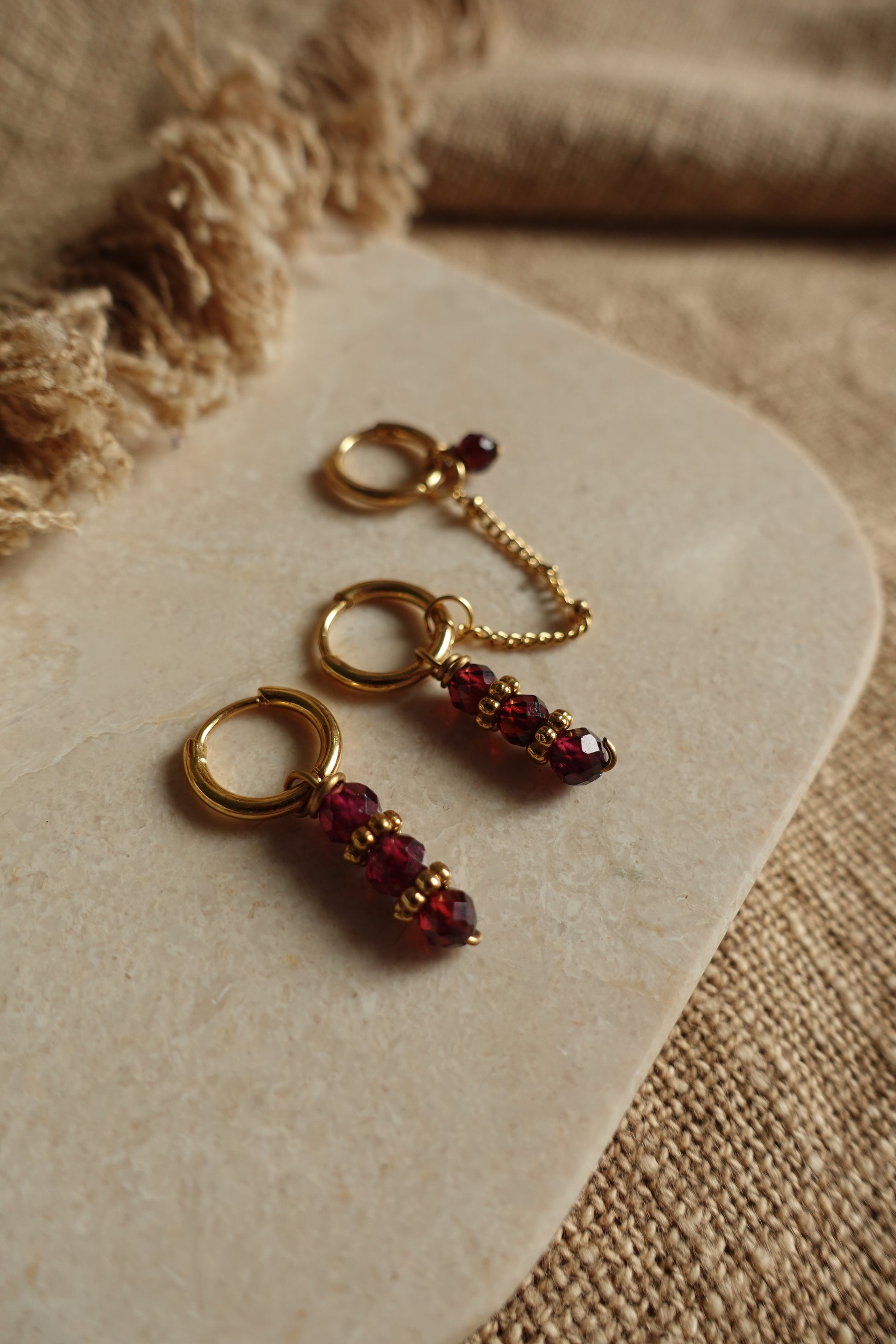 Modèle unique réalisé à la main en perles de grenat et acier inoxydable doré.