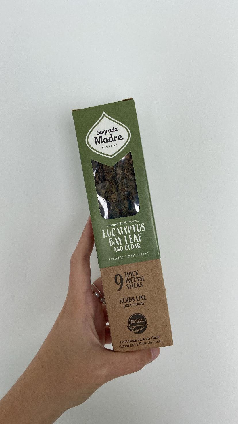 Nouvelle gamme d'encens, Sagrada Madre, à l'eucalyptus, laurier et cèdre, un encens unique fait à la main en Argentine. Fabriqué à partir de feuilles d'eucalyptus, de feuilles de laurier, de bois de cèdre et de carbone, collés avec un liant d'origine végétale.