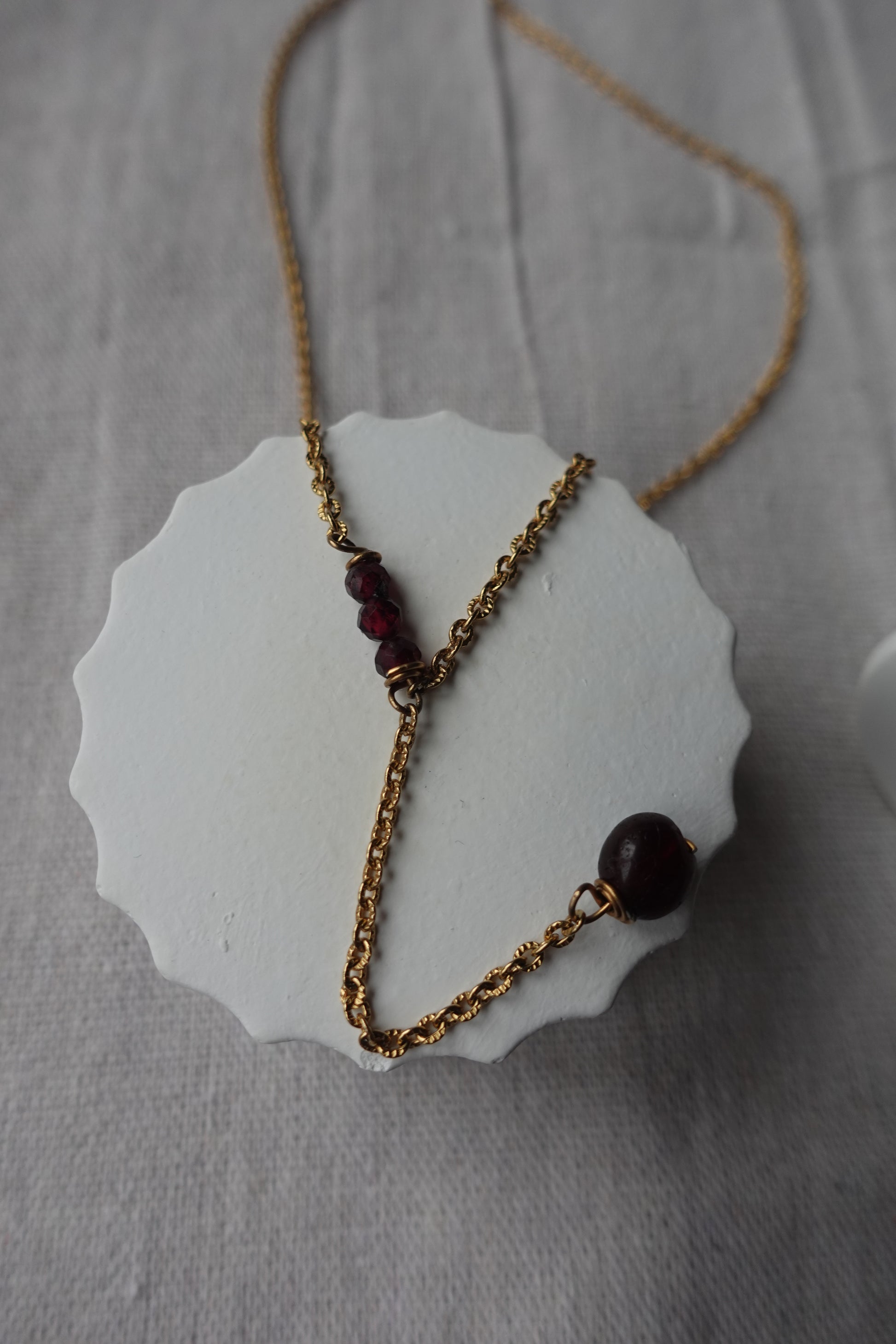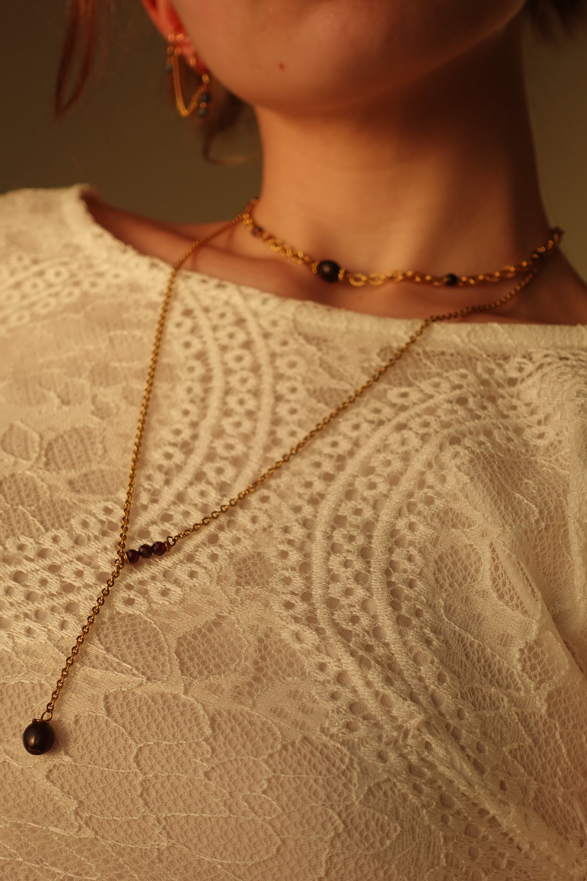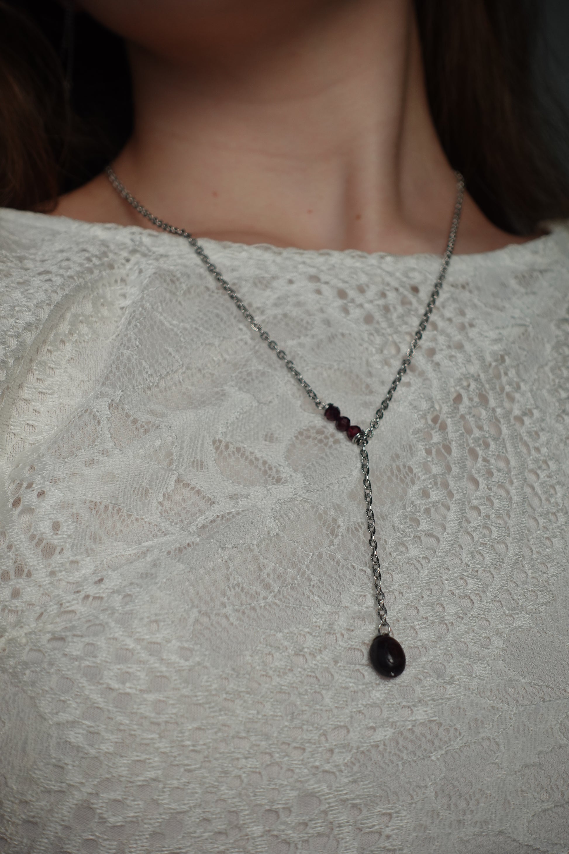 Collier réalisé à base de perles de grenat et d'acier inoxydable.