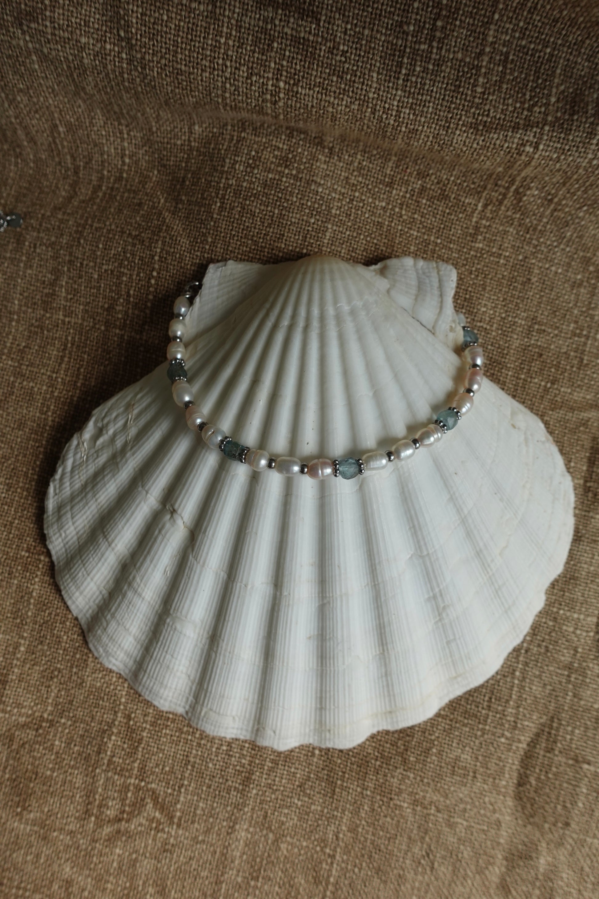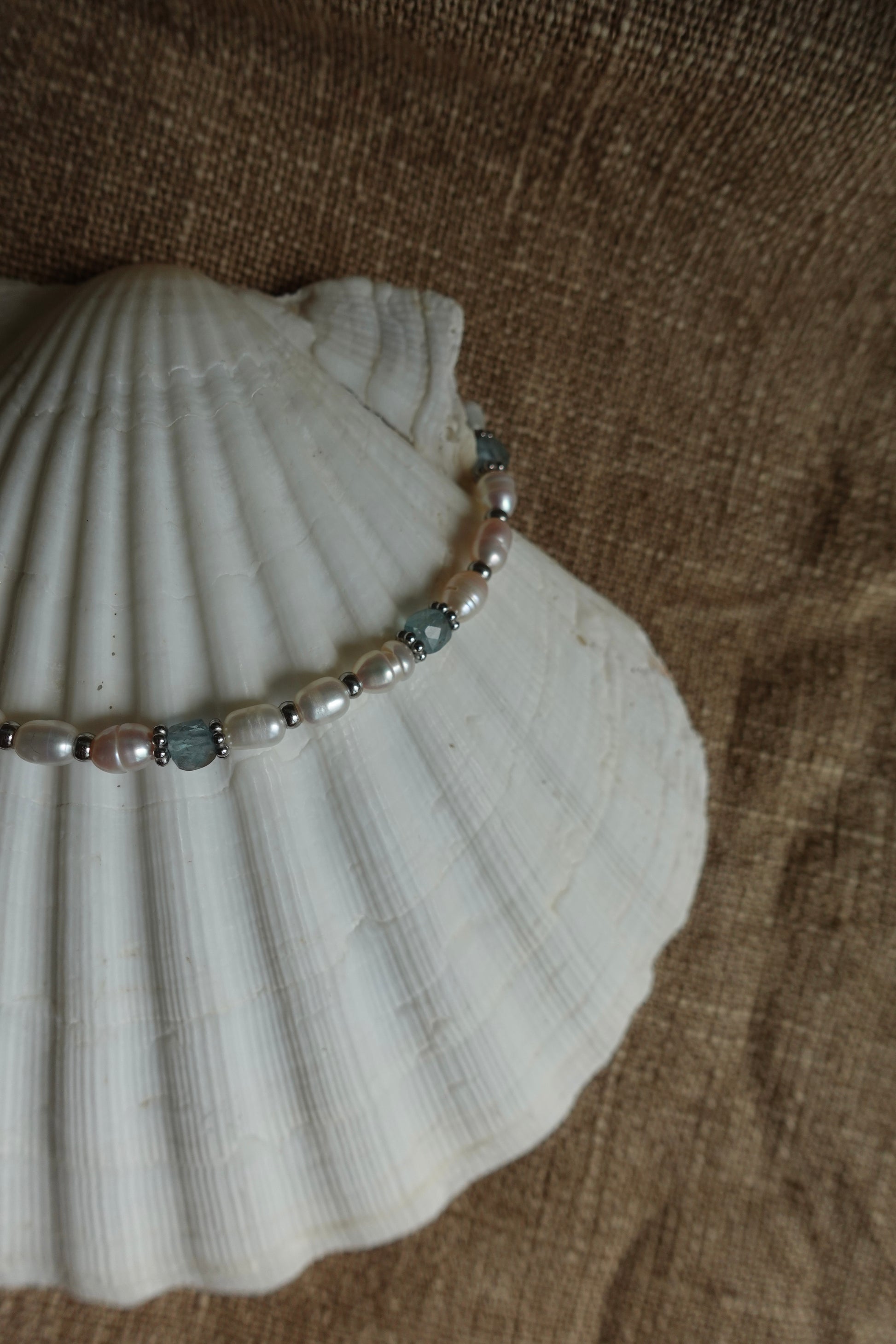 Modèle unique réalisé à la main en perles d'eau douce, apatite et acier inoxydable argenté.
